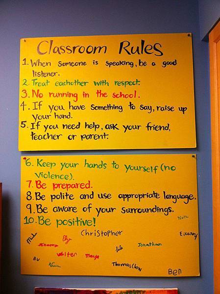 老師讓這些孩子自已決定規則,讓我感到很有趣。在亞洲,多是老師立定規則的多,孩子們只有遵守的份,可是這位老師,很認真的把這些規則寫下來,然後掛到明顯的地方,自已定的規則,自已遵守起來,也沒有什麼好抱怨的。這就叫做“ownership”擁有感吧。